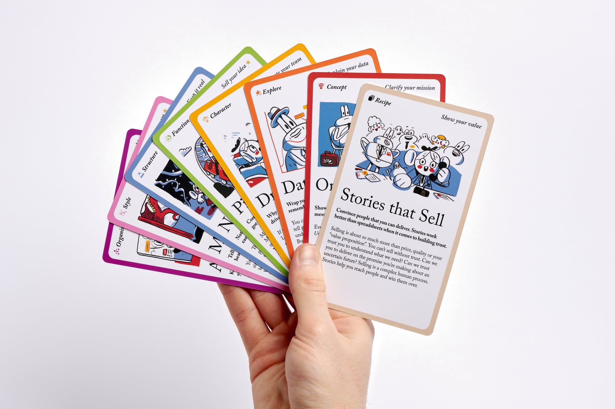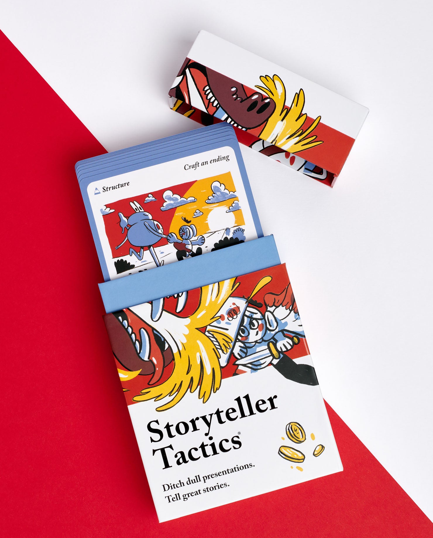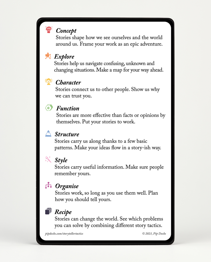 Each tactic fits on the back of a card, so it’s easily scannable, with techniques and inspirations to help you develop, structure and present your story.