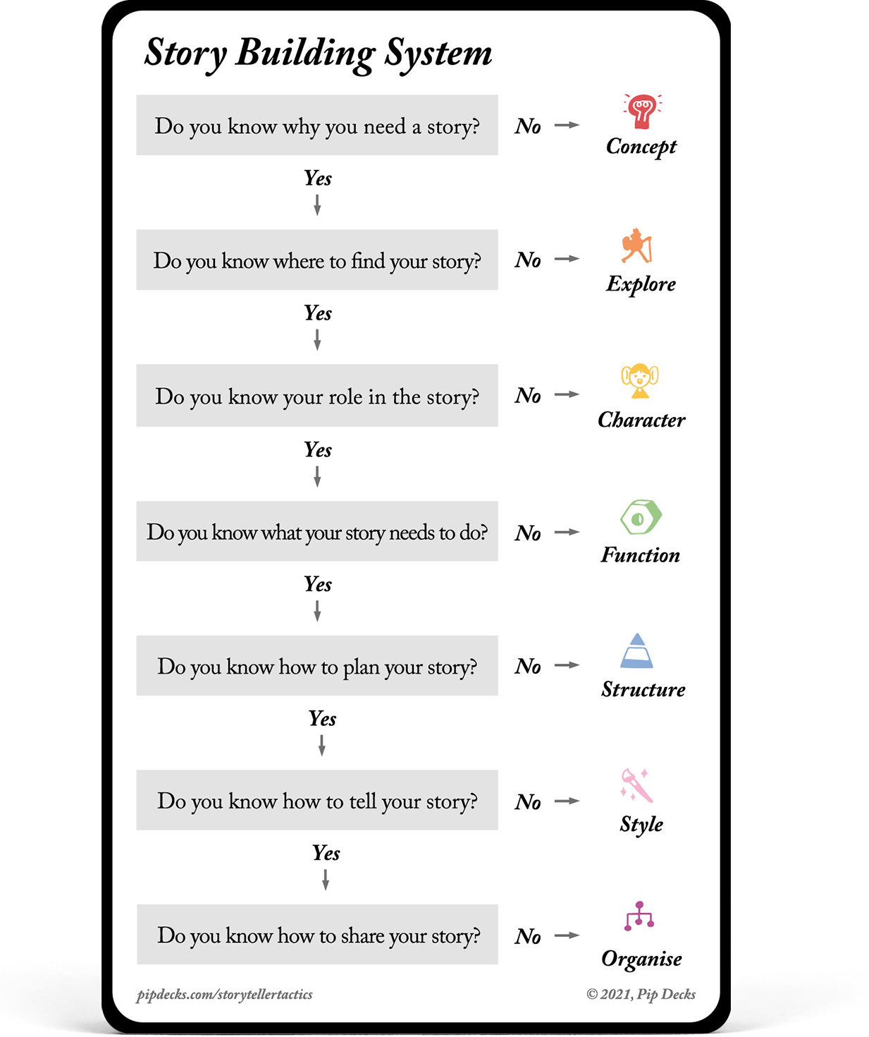 You’ll always choose the right approach with the Story Building System. A simple set of questions that help you find the most useful category of tactics.